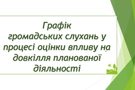 Громадські слухання проводяться з метою врахування зауважень і пропозицій громадськості до планованої діяльності суб’єктів господарювання області. Проведення громадських слухань сприяють обговоренню планованої діяльності, що може мати вплив на довкілля. У період воєнного стану в Україні громадські слухання проводяться в режимі відеоконференції відповідно до Закону України „Про оцінку впливу на довкілля” та постанови Кабінету Міністрів України від 13 грудня 2017 року № 989 „Про затвердження Порядку проведення громадських слухань …